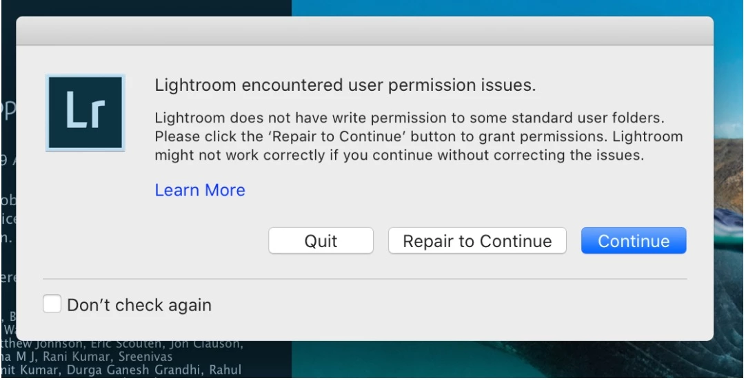 Lightroom does not have write permission to some standard user folders. Please click the ‘Repair to Continue’ button to grant permissions. Lightroom might not work correctly if you continue without correcting the issues.