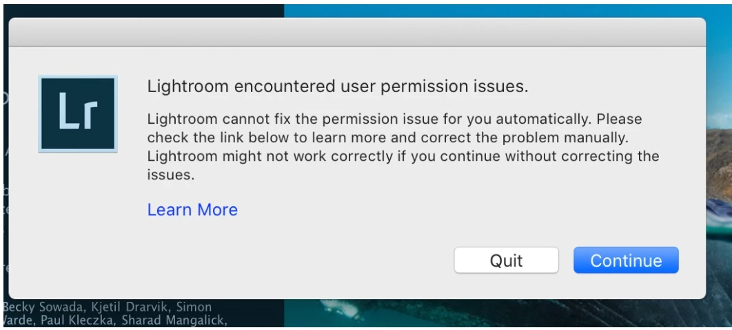 Lightroom cannot fix the permission issue for you automatically. Please check the link below to learn more and correct the problem manually. Lightroom might not work correctly if you continue without correcting the issues.