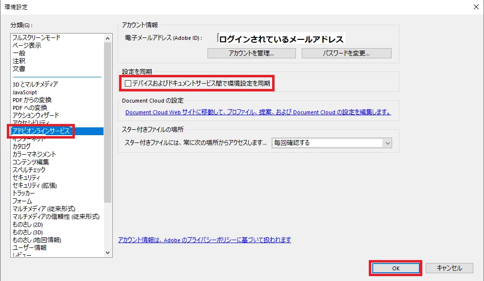 3. 分類の “アドビオンラインサービス” を選択し、"デバイスおよびドキュメントサービス間で環境設定を同期" のチェックを外し、[OK] をクリック