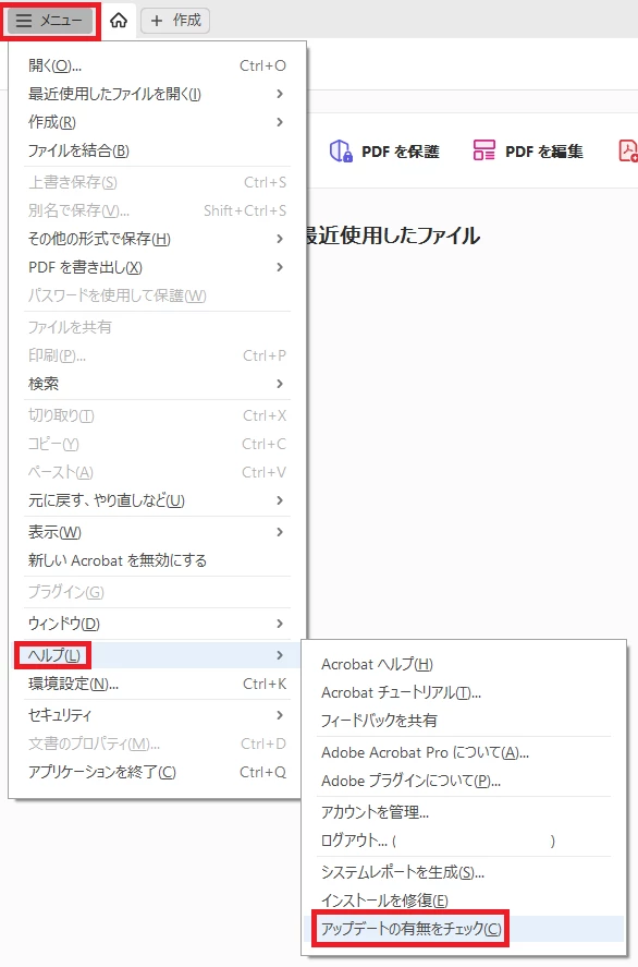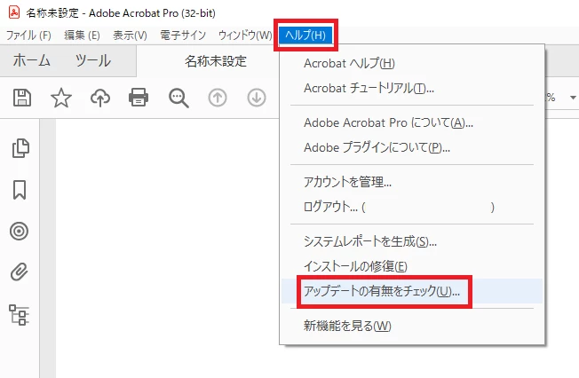・ [ヘルプ] - [アップデートの有無をチェック] の順にクリック