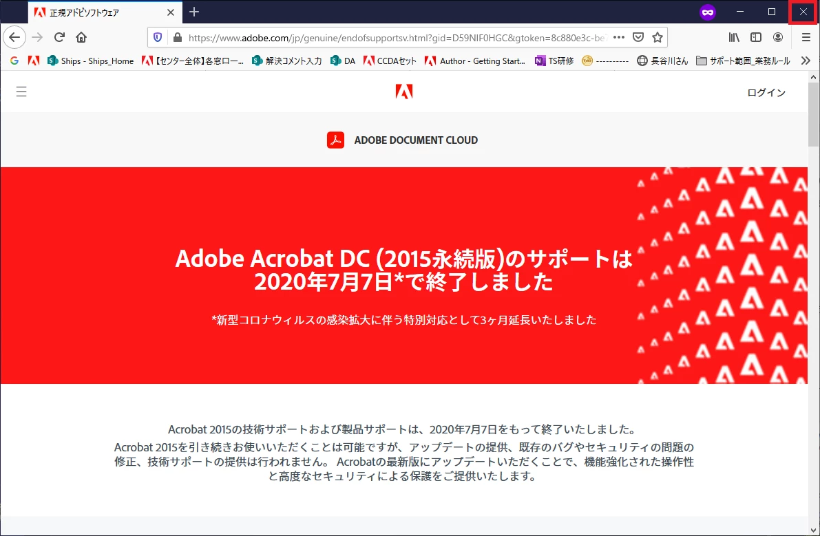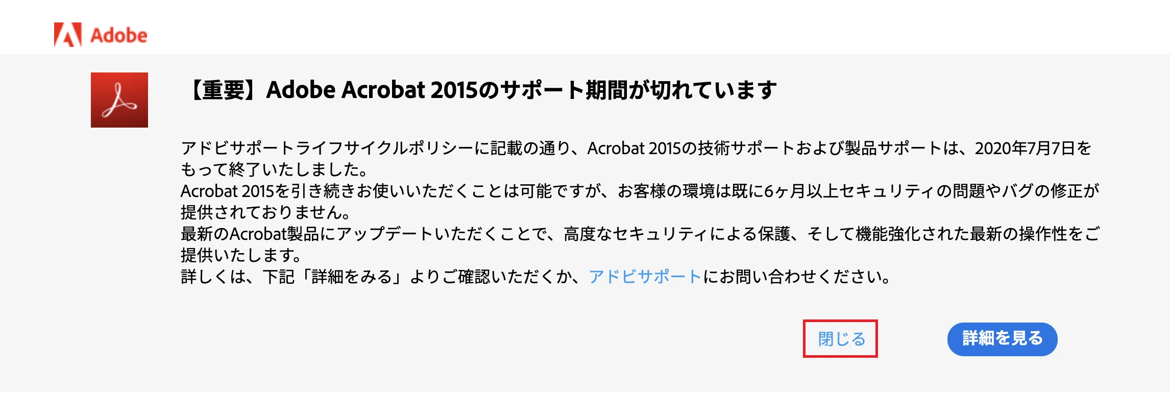 3. 「Adobe Acrobat 2015 のサポートは終了しました」 画面にて、[閉じる] をクリック