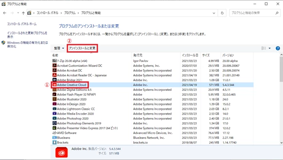 3. Adobe Creative Cloud をクリックし、[アンインストールと変更] をクリック