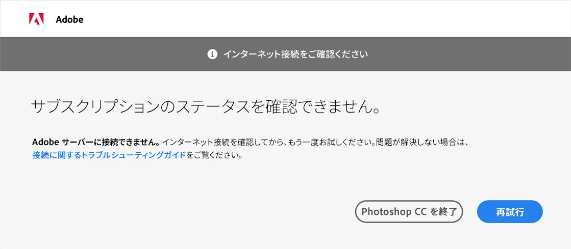 ネットワーク制限がされている環境でご利用されている場合に Adobe の認証サーバーと接続できないため、発生している可能性がございます。