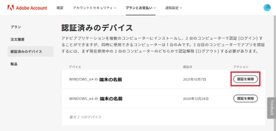 - Adobe マイアカウントの認証済みのデバイス にアクセス