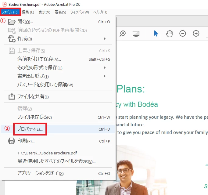 ① 該当の PDF ファイルを Acrobat で開き、[ファイル] をクリック
