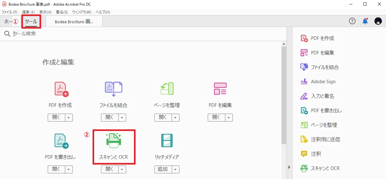 ① 該当の PDF を Acrobat で開き、[ツール] > [スキャンと OCR] の順にクリック