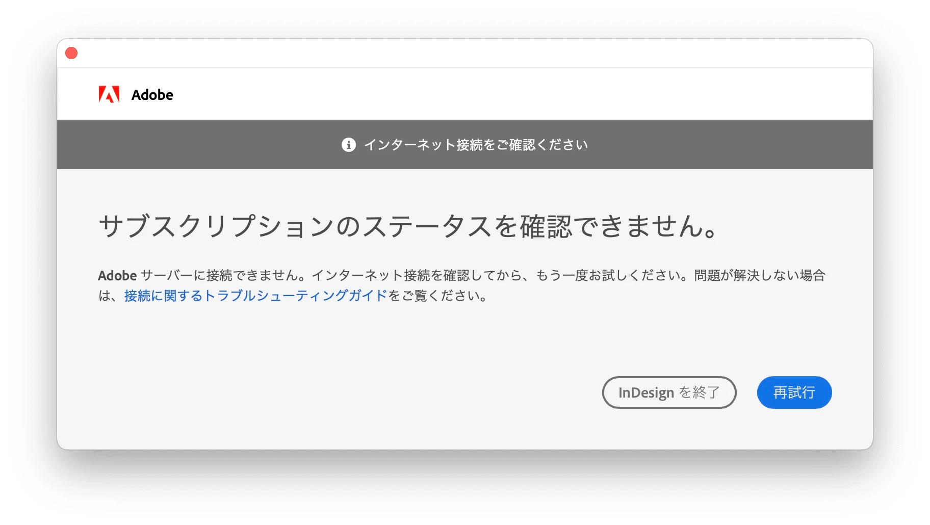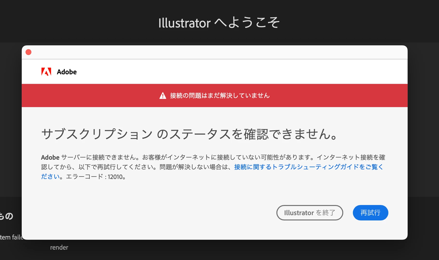 オフライン起動を試すも、一度CreativeCloudでの認証の試みをしていたからか、「サブスクリプションのステータスを確認できません」で起動されず詰んでいます。
