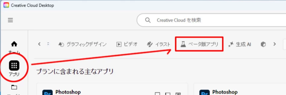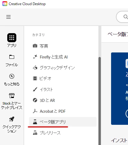 1.Creative Cloud アプリを起動し、カテゴリとして「ベータ版アプリ」を選択します。