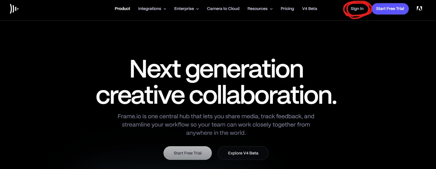 1. Frame.ioへアクセスし、右上の「Sign in」ボタンを押します。
