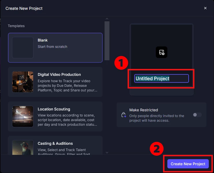 2. お好きなプロジェクト名を入力(❶)し、「Create New Project(❷)」ボタンをクリックします。