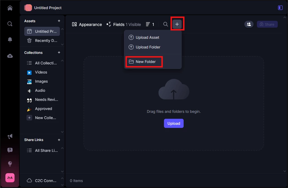 4. 右上の「+」をクリックし、「New Folder」を選択し、フォルダーを作成します。