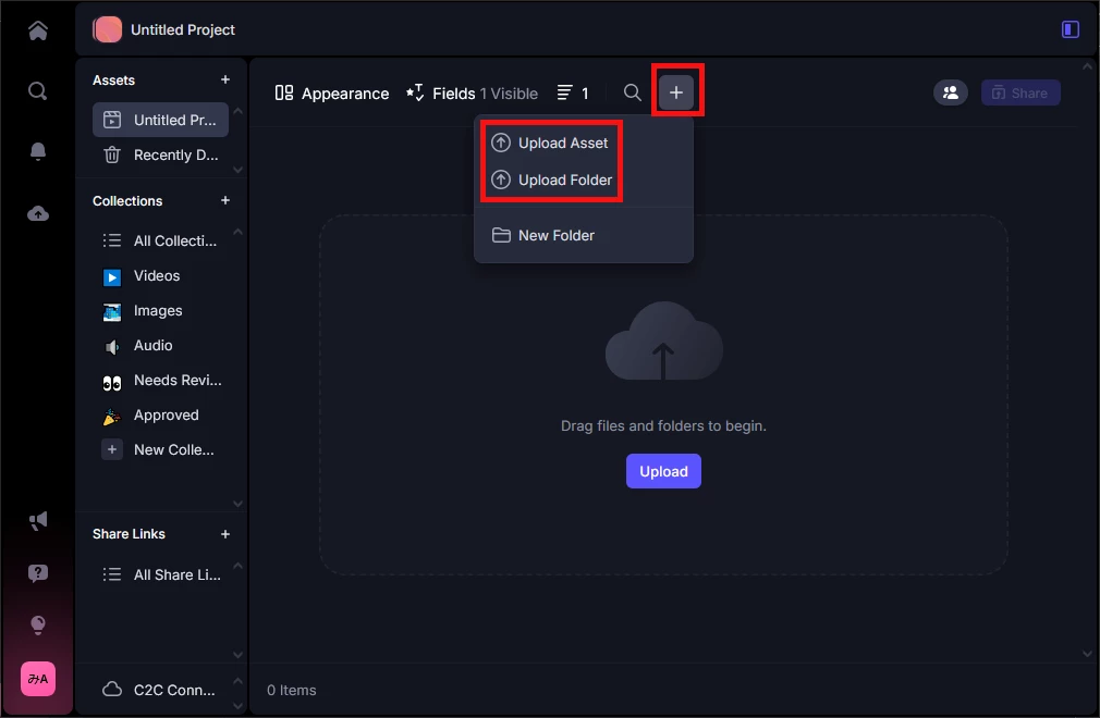 6. 右上の「+」をクリックし、「Upload Asset」または「Upload Folder」を選択し、アップロードするデータを選択します。