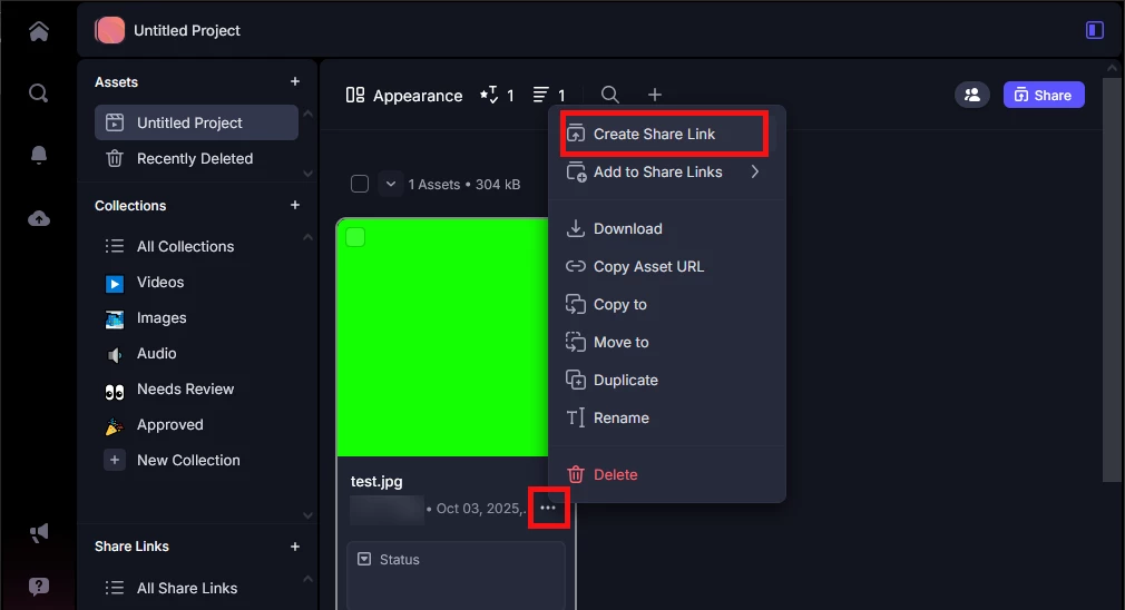 8. 手順4で作成したフォルダーの右下にある「・・・」をクリックし、「Create Share Link」をクリックします。