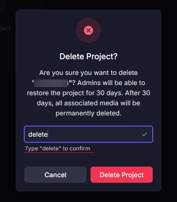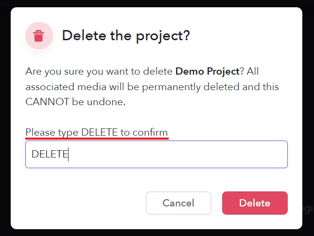 ※Projectを削除する際には、スクリーンショット下線部分と同じ文章の入力が必要となります。