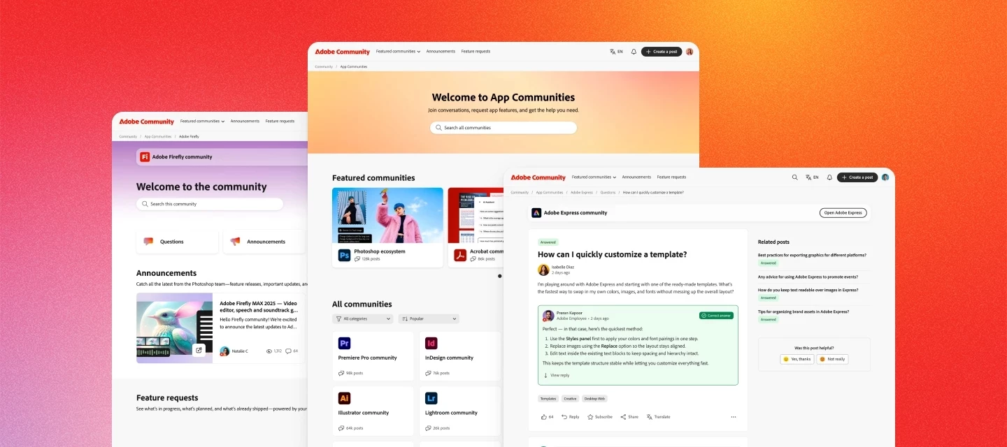 新しいコミュニティフォーラムが正式に公開されました。いまご覧いただいているのは、つながりやすく、フィードバックを共有しやすく、皆さんのアイデアがどのように アドビ製品づくりに役立っているかを確認しやすいよう再構築されたスペースです。