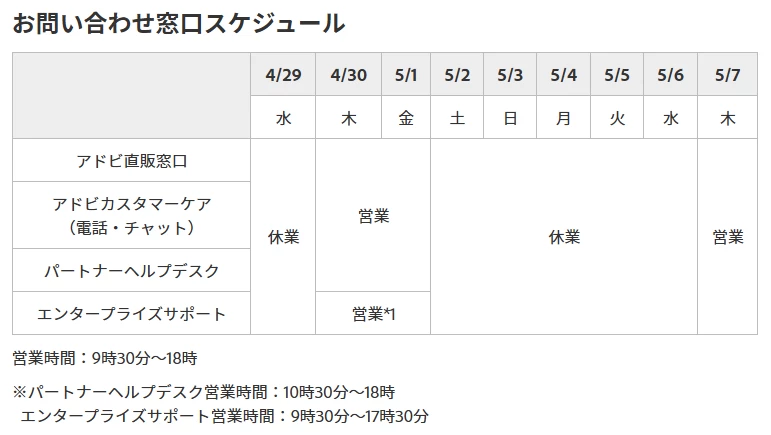 2026年ゴールデンウィーク期間のサポート窓口について | アドビ