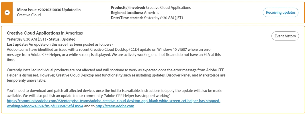 また、コミュニティ「Adobe CEF Helperが動作しなくなった」https://community.adobe.com/t5/enterprise-teams/adobe-creative-cloud-desktop-app-blank-white-screen-cef-helper-has-stopped-working-windows-1607/m-p/11886875#M31994http://status.adobe.com にアップデートを公開します。
