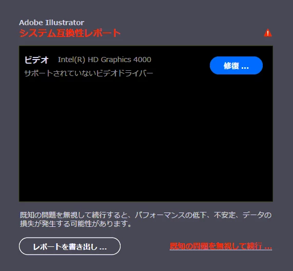 2021年2月9日にリリースされた、Illustrator 25.2バージョンでは、お使いのシステムに互換性のないグラフィックカードのドライバーが検出された場合、Illustrator起動時に下記の「システム互換性レポート」が自動的に表示されます。