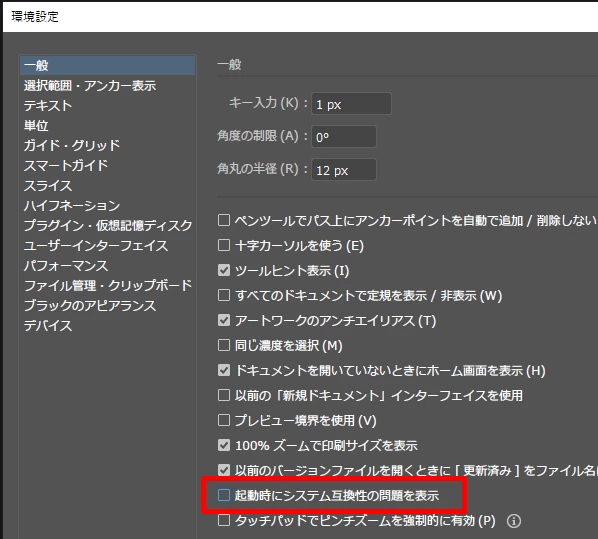 ※Macの場合は「Illustrator>環境設定>一般」