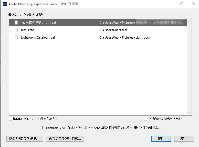 Lightroom Classicを起動する前に、Windowsでは[ Alt ]キー、macOSでは[ option ]キーを押しながら起動することで、「直近で開いたことのあるカタログ」の一覧を表示することが出来ます。