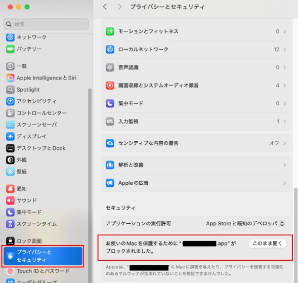 Macのバージョン13以降、セキュリティにより実行がブロックされる動作が確認されています。