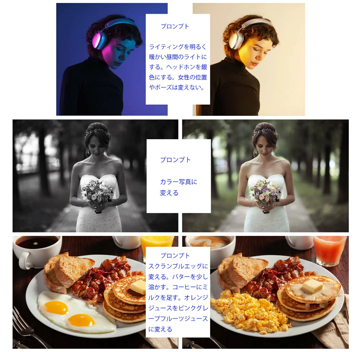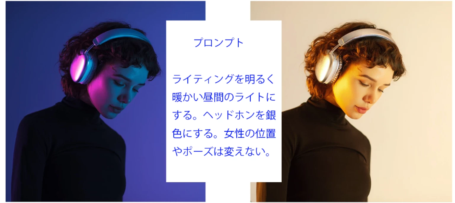 今回ベータ版に搭載されたFirefly Image 5は新しい生成モデルで細かく指示をして編集するワークフローです。Firefly Image 5はAdobeの最先端の画像生成、編集のモデルでプロンプトだけでより直感的により正確に画像を編集することが可能です。画像全体を変換するのに平易で自然な言葉でどう変えたいかを説明するだけです。昼夜を入れ替えたり、被写体のポーズを変えたりを元画像にあるその他の部分はそのままにハイクオリティな結果が入手できます。