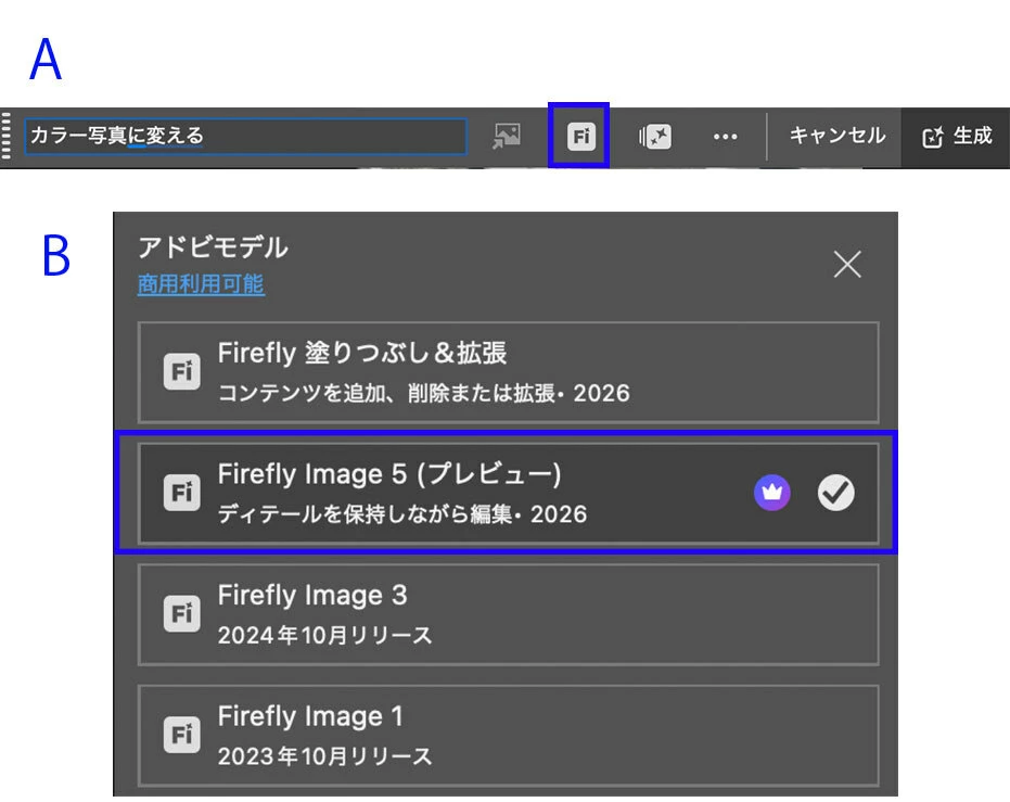 3. コンテキストタスクバーのモデルピッカーより Firefly Image 5 (プレビュー)を選択(下図中B)