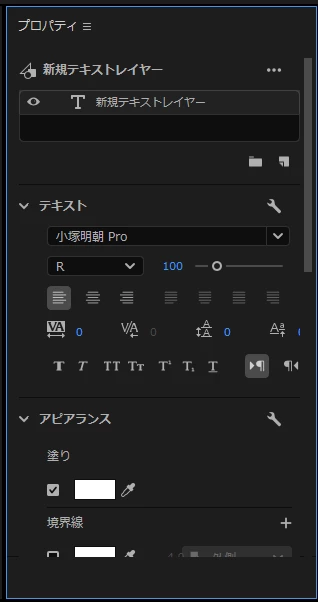 これまでのバージョンでの「エッセンシャルグラフィックス」→「編集」タブにあたるテキストの編集は、25.0バージョンより「プロパティパネル」にて行うようになりました。