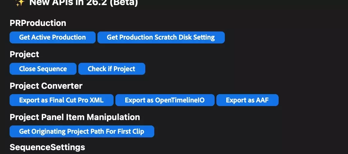 「premiere-api」サンプルプラグインに多数の新しいAPIを追加しました。ドキュメントの更新も近日中に公開予定です。これらのAPIは、現在のベータ版ビルドおよび次回の公式リリースで利用可能です。技術的なご質問は、Premiere UXP開発者フォーラムまでお寄せください。これらのAPIが皆様のお役に立てば幸いです。今後もAPIの拡充を予定しています!