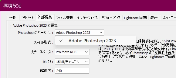 そこで、Lrの環境設定で連携ソフトを指定しようとしたが、Photoshop2023しか見えない。