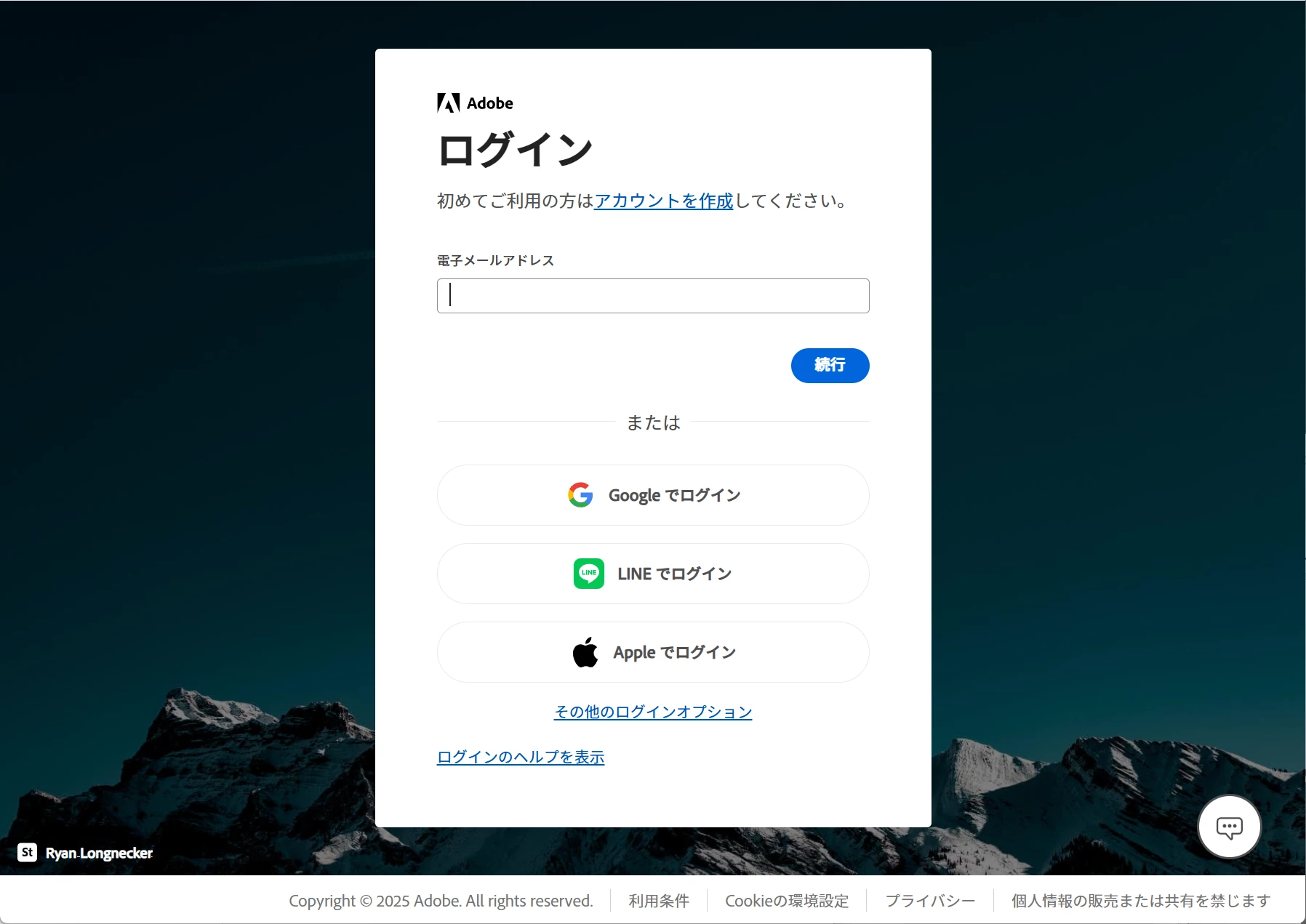 アドビのログイン方法は、メールアドレスを入力してのアドビアカウントのログインのほかに、Google、LINE、Appleのアカウントを使ってのログインもできます。