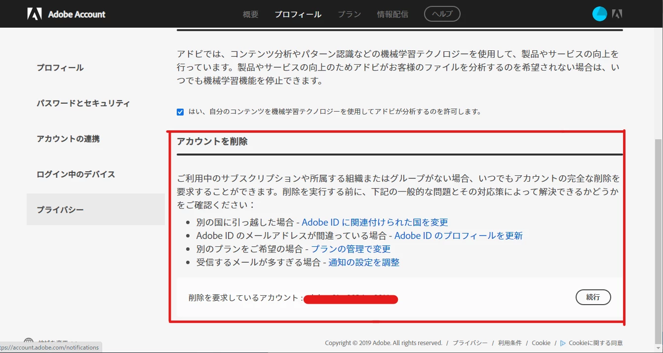 ログインさえできれば、自分でAdobeアカウントを削除できるようになっているようです。