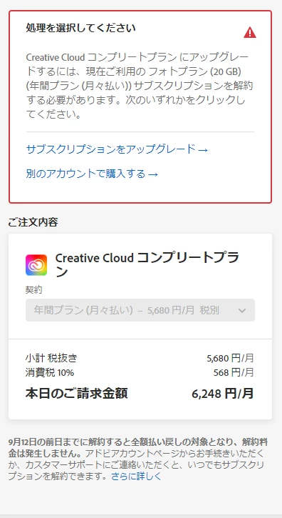 コンプリートプランの購入手続きをしようとしたところ、プレミアプロの単体のを解除するようにもとめられ、コンプリートプランの購入ができませんでした。この時点でだいぶ不親切だと感じましたが、プレミアプロの単体の解除を行いました。