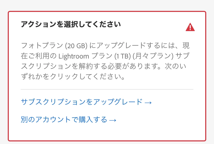 ですが、後々Lightroom classicとフォトショップのセットを見つけて、Adobeの方を解約したのちにフォトセットを購入しようとしたら、アクションを選択してくださいなんてと出てきます。