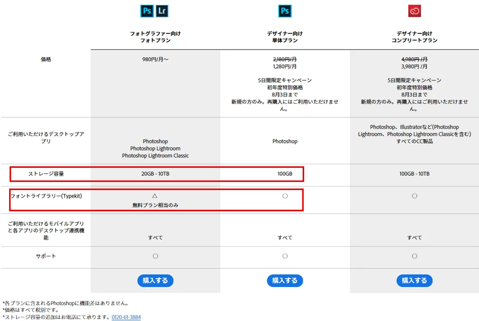 それは、フォトグラファー向けフォトプランは、ストレージ容量が少ない、フォントライブラリー(Typekit)に制約があることです。