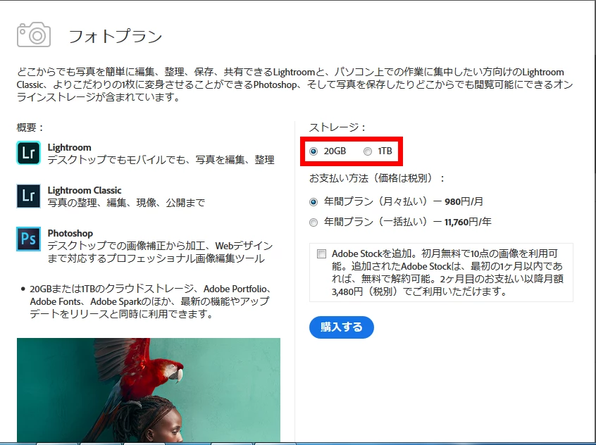 他の単体プラン(Illustrator等)のクラウドストレージは100GBですから、フォトプランは20GBにしておいて、同じAdobeIDで契約することで120GBとすることは可能ですが、価格的に1TBのフォトプランの価格を超えてしまいますのであまりおすすめは出来ません。