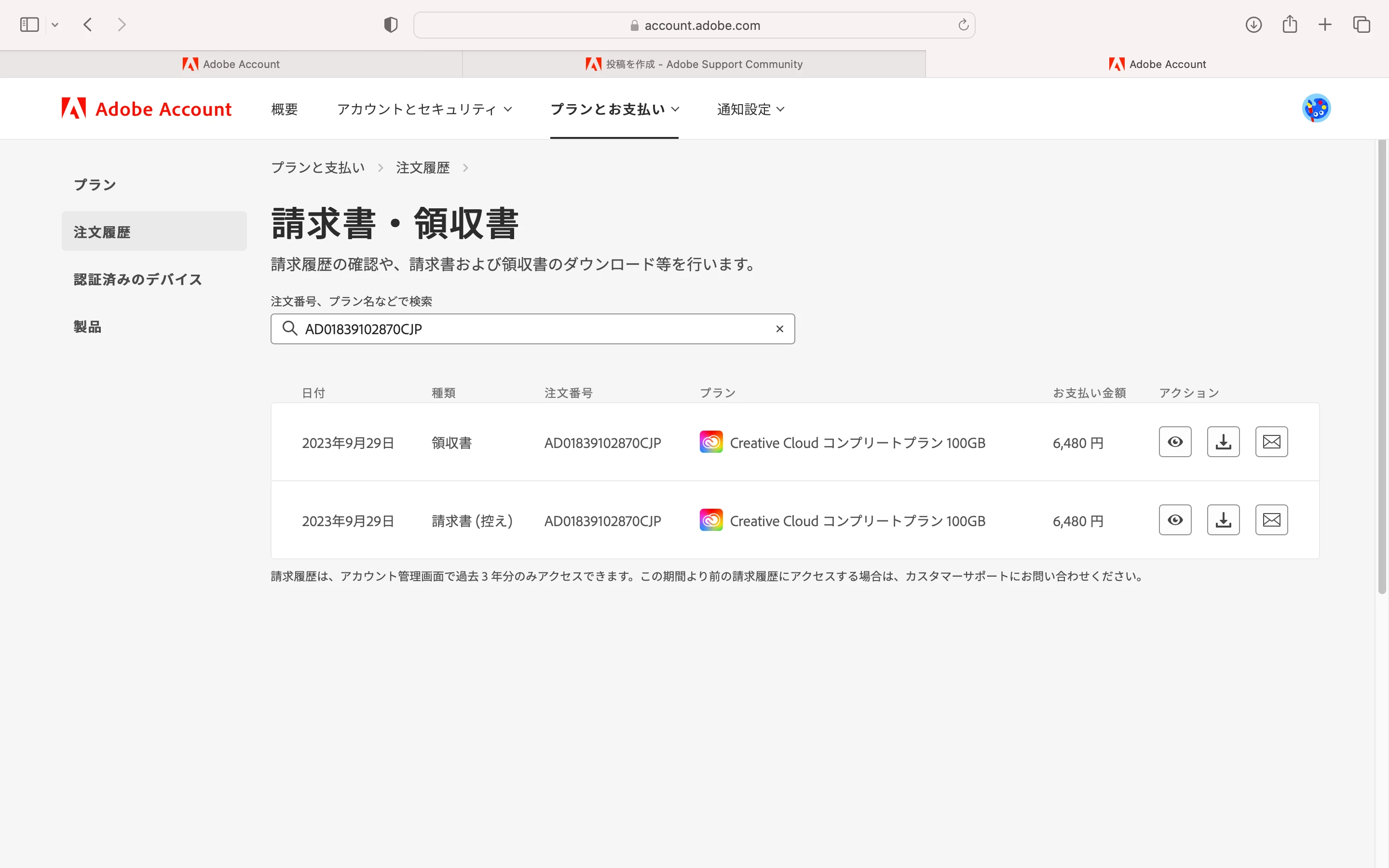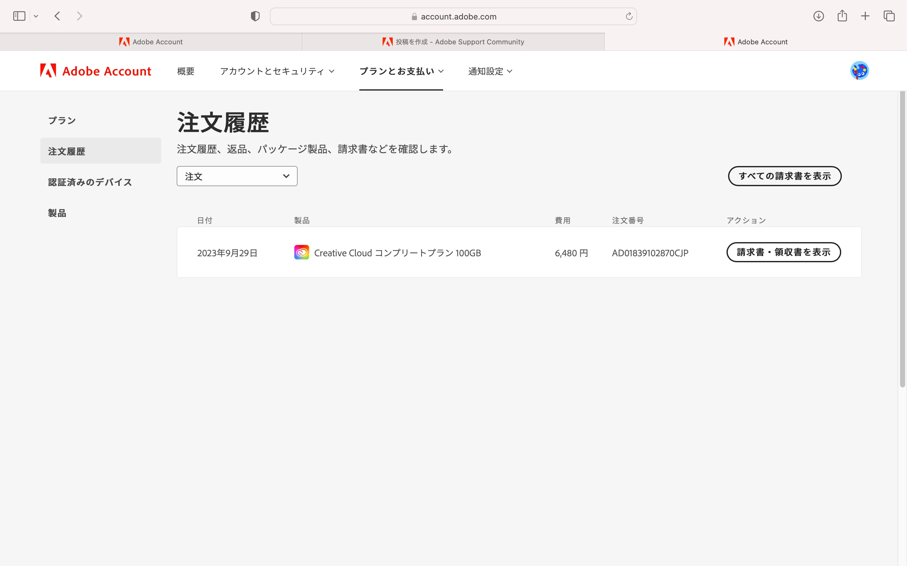 表示されるプランに二重の被りがなければ、「いまログインしているアドビアカウント」で「二重注文になっていない」という判断ができます。システムがバグってなければですが。