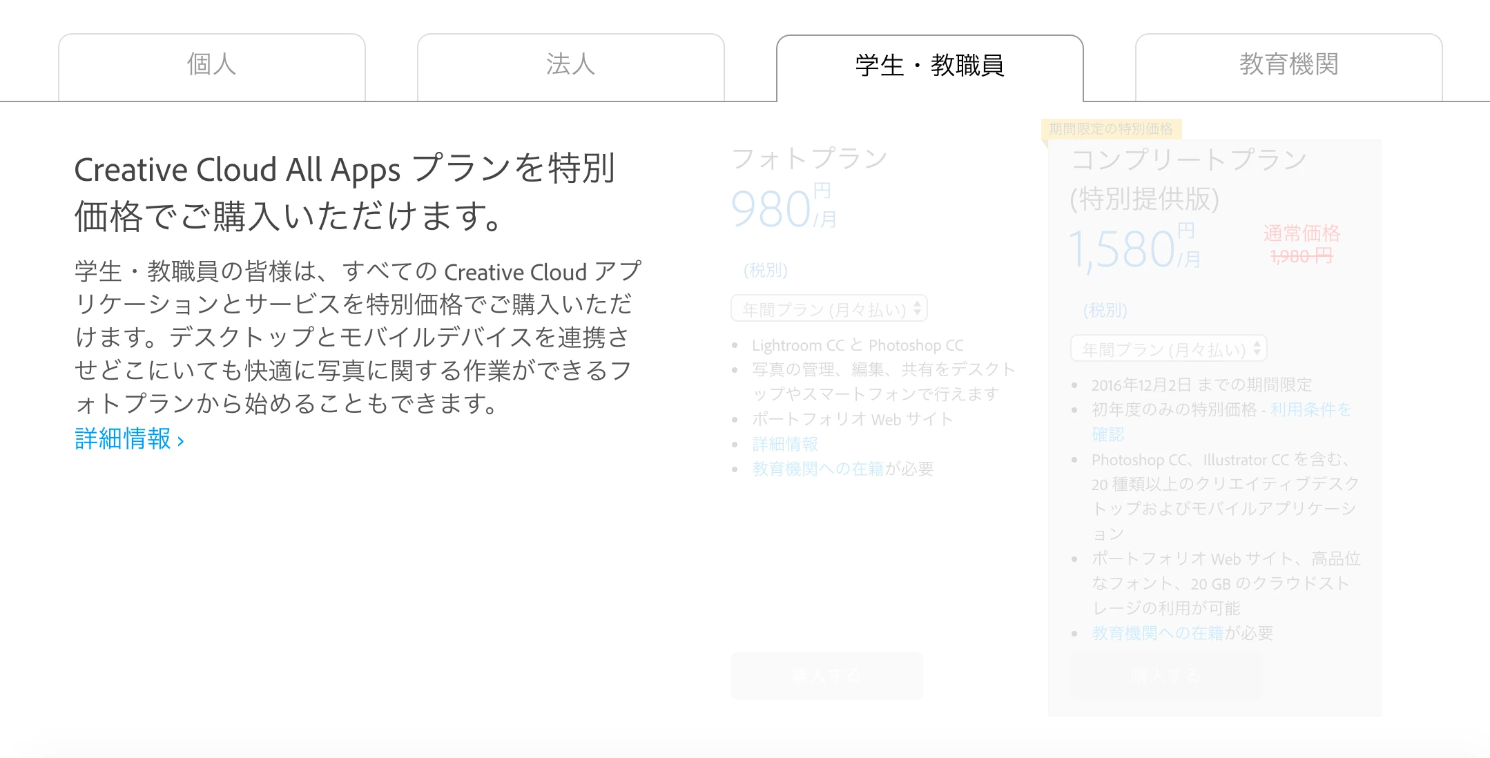 今Creative Cloud無償メンバーシップを使用していますが、学生・教職員個人版のコンプレートプランへ移動したいと思います。