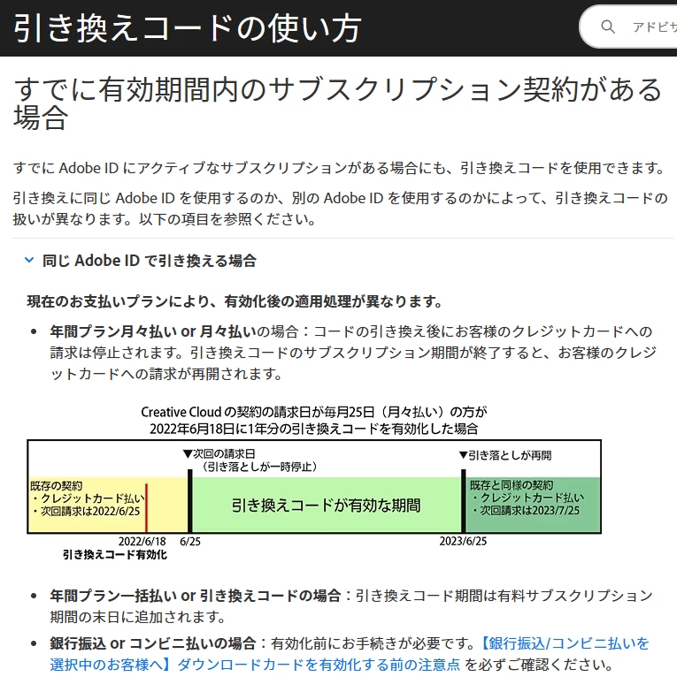 年間プラン月々払いの場合,既存契約期間中に「引き換えコード」を使用すると,いったん「月々払い」が停止されて引き換えコード分が開始されます。引き換えコード分終了後に既存契約再開となるので,早期解約料も発生することになります(契約残存期間の料金の50%の一括払い)。