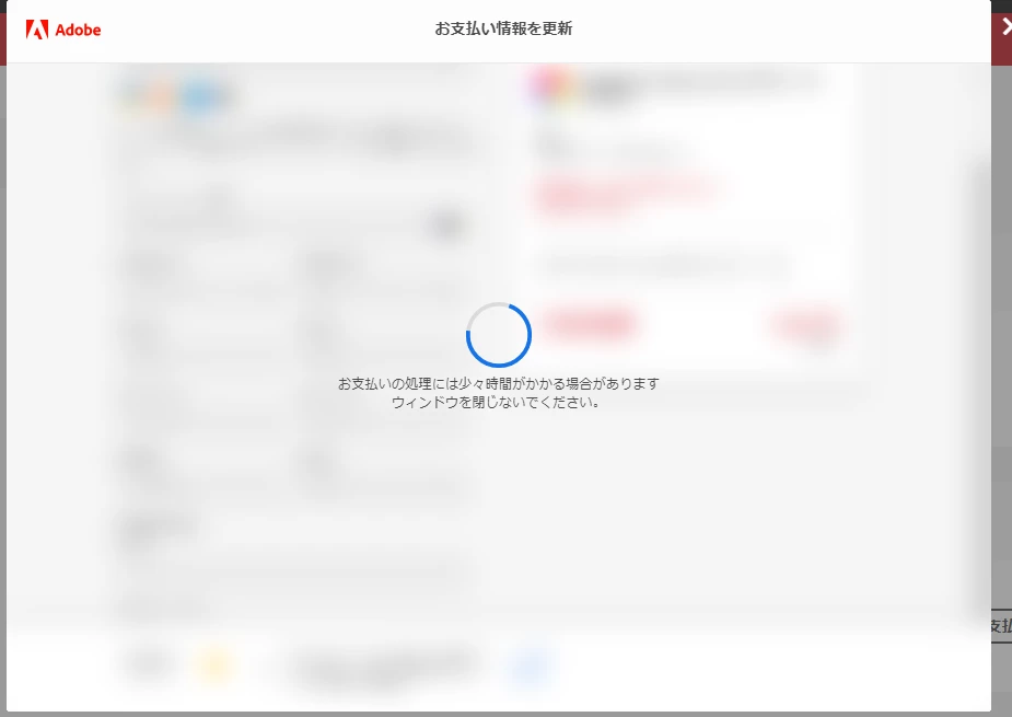 延滞していた支払いを済ませたいのですが、支払情報を保存し更新しようとしても画像にあるウィンドウが表示されるだけで処理が終わりません。もうすでにウィンドウを表示したまま閉じることができずに二日たとうとしています。