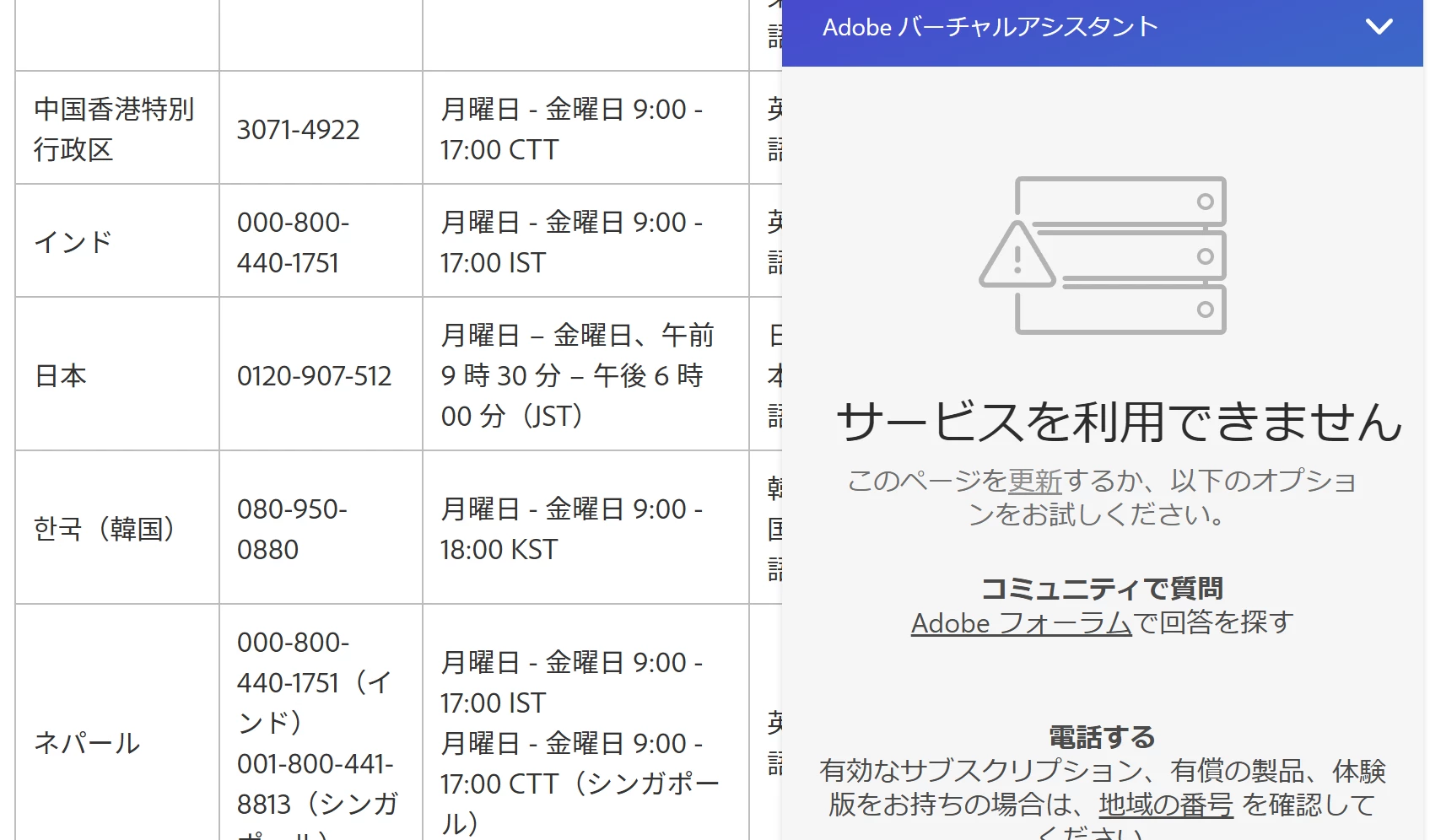 Mmagical_reporter8109ParticipantForum|Forum|3 months agoOctober 20, 2025QuestionAdobe Creative Cloud の支払いに対するサポートセンターForum|Forum|3 months agoOctober 20, 20251 reply114 viewsアカウントの更新を切り替えようとするとできません.そのため,サポートセンターに問い合わせたく,チャットシステムを利用すると,サービスを利用できない,と添付ファイルのとおり出ました.そのため,サポートセンターに電話で問い合わせをすると,指定された電話番号先は「有効な接続機器に接続されていないため,呼び出しができません」とのことです.非常に困ってます.どのように連絡を取ったらよろしいでしょうか?お支払があるので,大至急対応をお願いします.