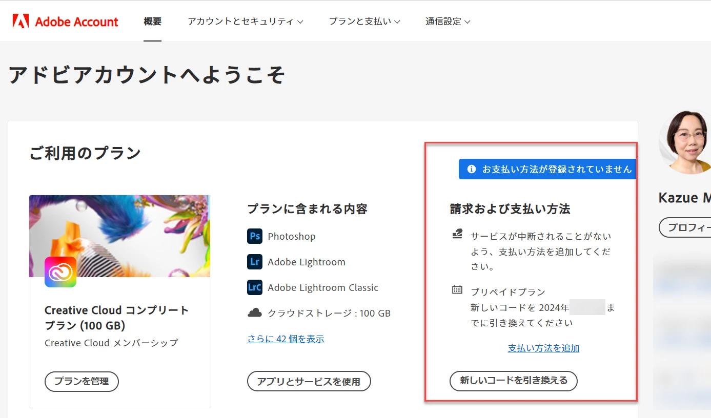 わたしも、Amazonで販売しているコードを購入して契約しているのですが、次のAdobe Accountのスクリーンショットに表示されている「プリペイドプラン」の項目に、次の引き換え日(オンラインコードでの現在の契約終了日)が表示されています。