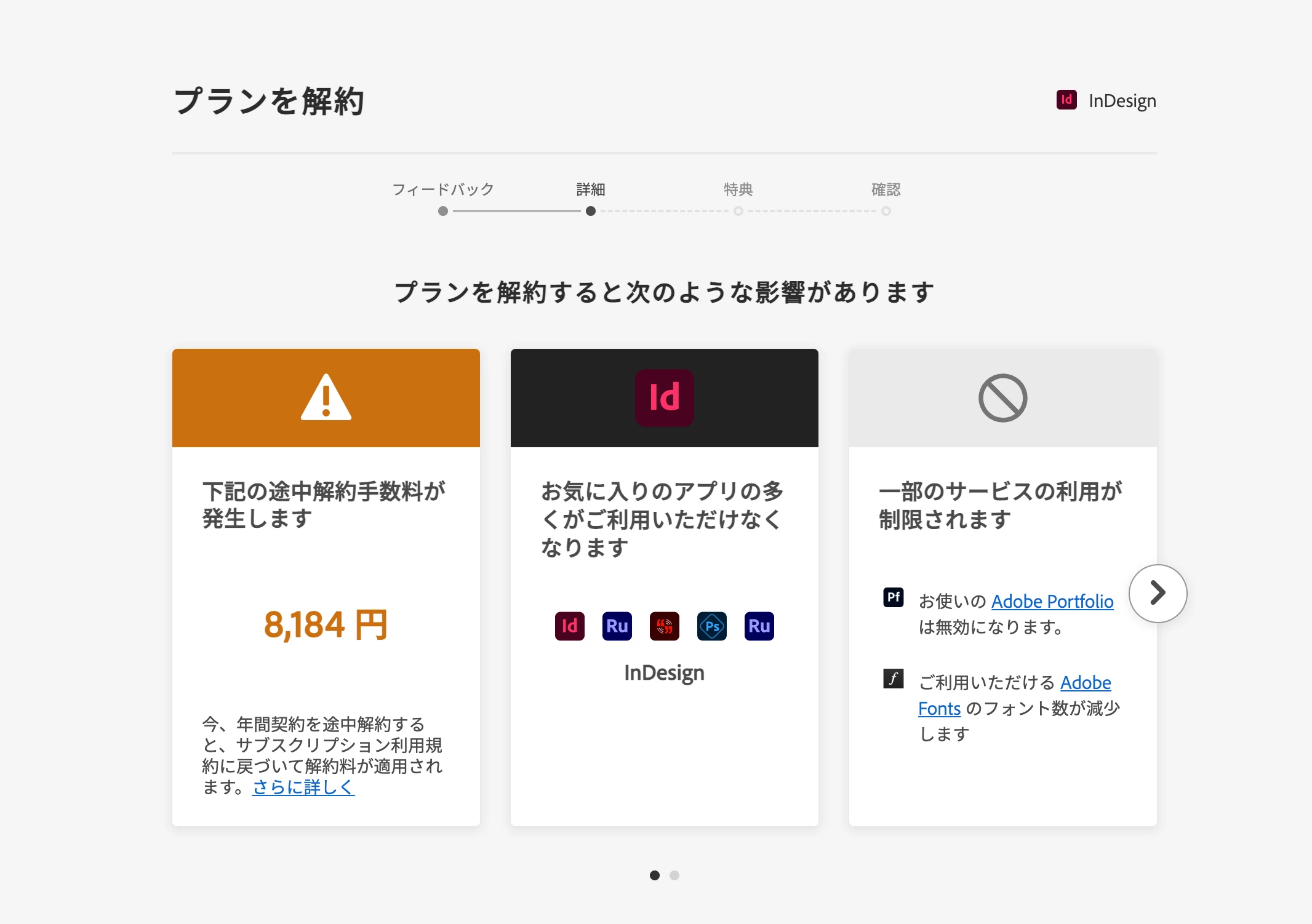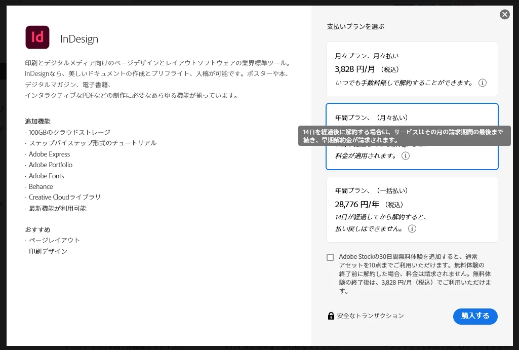 HHIROYUKI28044371q3u5ParticipantForum|Forum|3 years agoJanuary 21, 2023質問indesignのサブスクリプションサービスにおける途中解約手数料について。Forum|Forum|3 years agoJanuary 21, 2023返信数 4.755 ビューindesignの年間契約(月々払い)を解約しようとしたところ、8184円の途中解約手数料を請求されました。 2022年7月26日から無料体験期間が始まり、8月2日から有料サービスに切り替わり、2023年1月2日請求分の支払いが完了しているので、6か月間利用したことになります。 契約に従い手数料はお支払いいたしますが、8184円という手数料の根拠を教えていただけないでしょうか? 手数料の項目の詳細や計算式等が明示されているドキュメントへのアクセス方法を教えていただく形でも構いません。その場合は当方で確認いたします。Creative Cloud