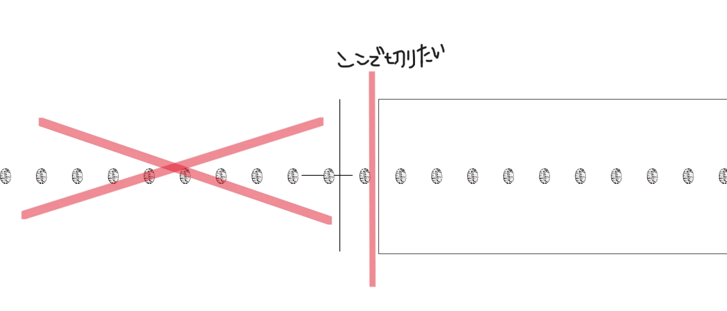 ②この豆の連続模様が枠線をはみ出しているので、枠線に収まるように模様を切りたいですのですが、何か方法はありますでしょうか。この枠線をクリッピングマスクとするとか・・・?