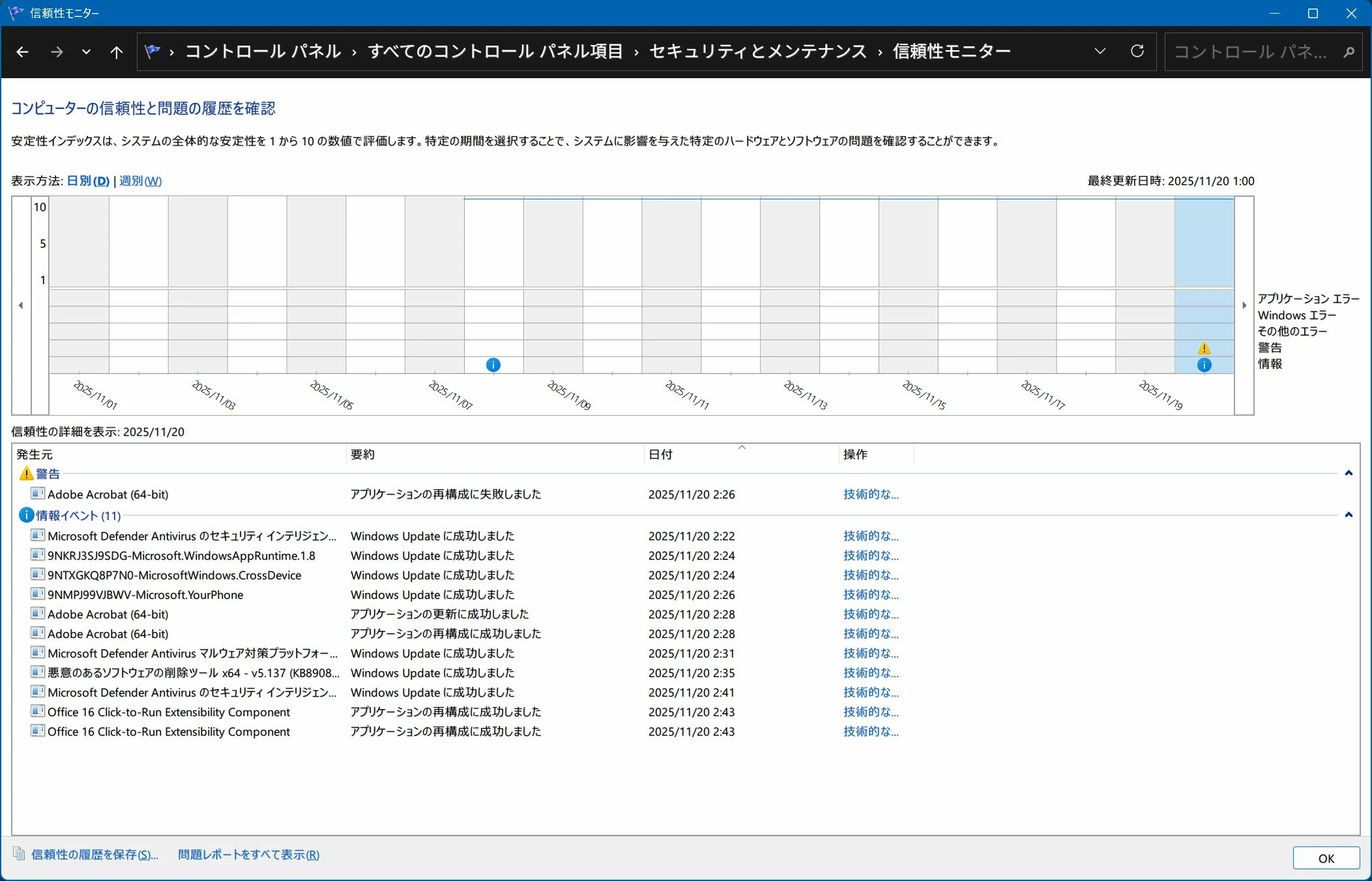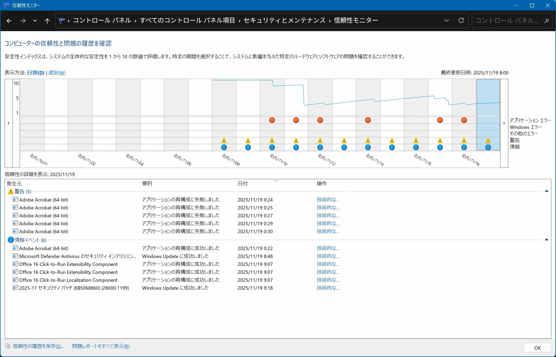 WINDOWS CANARY(Build.28000)で、ACROBATが「アプリケーションの再構成が失敗しました」と、信頼性モニタに多数記録されることが起きてます。