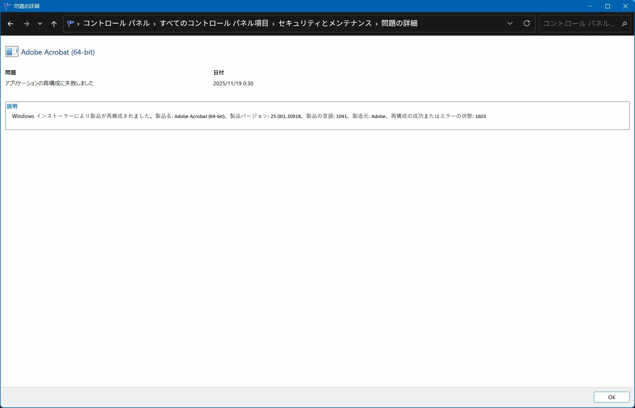 ACROBAT自体は動作してるので、実害はありませんが、報告しておきます。