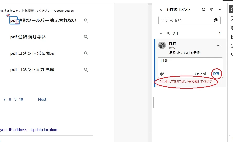 アクロバットでPDFを開き,コメントを追加して,次に別の箇所にコメントを入れようと移動すると,添付画像のように「キャンセルするかコメントを投稿してください」というメッセージが表示され,「投稿」ボタンをクリックしないと,次のコメント入力に進めず,最初に入れたコメントも確定しません。以前はただコメントを入れるだけで自動的に確定して,次に進めたと思うのですが,今はコメントを入れるたびに「投稿」をクリックするというワンアクション多く求められます。これは新しい機能なのでしょうか。この機能をオフにする方法はないのでしょうか。