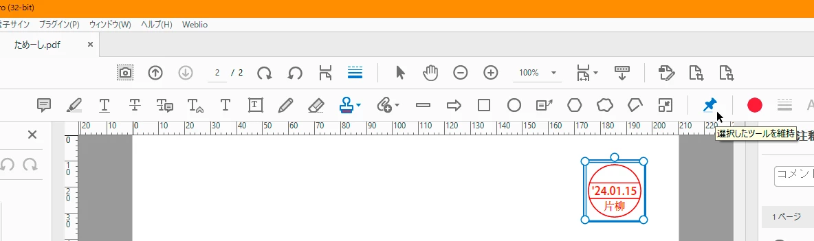 旧UIでは,コメントツールを開き使用するツールを選択するとピンアイコンがアクティブになり,ツールごとに連続/単発を選択できます(画像はWindows10/AcrobatPro32bit版)。新UIの確認ができないのですが,たぶん同様のことができると思います。
