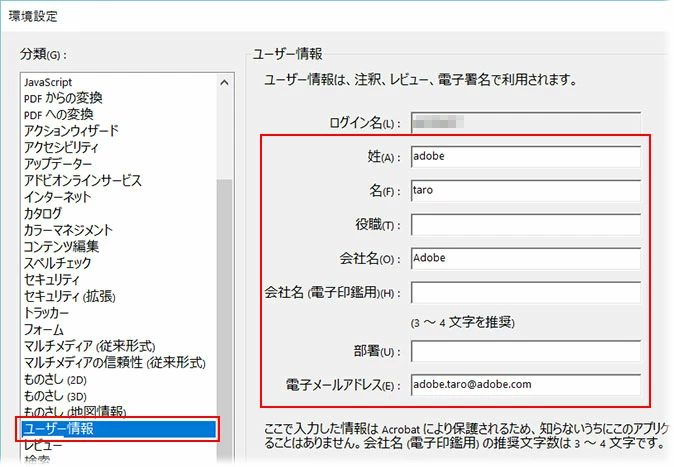 ダイナミックスタンプの姓名、メールアドレス等の表示は、ユーザー情報と結びついております。