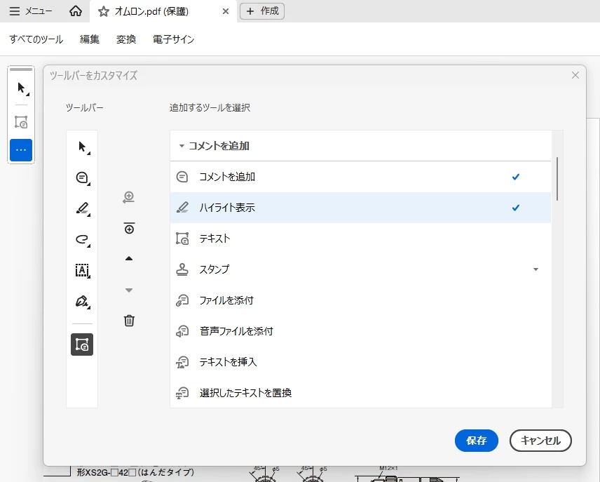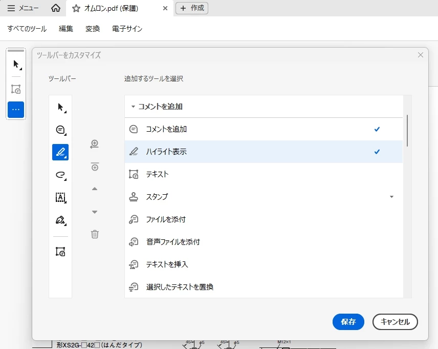 PDFにマーカーでハイライトを付けようと思って、ツールバーのハイライトのアイコンを探すとテキストの選択ツールしか表示されていなかった。そこで、「ツールバーをカスタマイズ」から編集を試みた。しかし、デフォルトのアイコンに関しては一切編集することが出来ず、他のアイコンを追加することも出来ない。